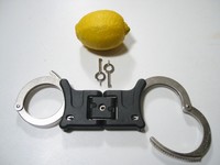 США. «Smith & Wesson». М-100.Система замка наручников относится к виду "Peerless" ("несравненные"). Принцип действия - сквозное прохождение дужки через базу – запатентован американским инженером Джордж Керни ещё в 1912 году. В 1970-х гг. патент потерял свою силу и теперь компании по всему миру повторяют их. Замки вида "Peerless" очень удобны в применении – они мгновенно надеваются и надёжно запираются. Они имеют также фиксатор, позволяющий заблокировать дальнейшее движение дуги и предотвратить возможное чрезмерное затягивание. Название фирмы не нуждается в представлении – думаю, вестерны смотрели все. Свой дизайн приобрёли в далёком 1932 году. Наручники вида "Smith & Wesson" М-100 относятся к оперативным наручникам – их удобно и незаметно хранить в кармане, но когда же появляется необходимость наручниками быстро можно обездвижить объект. Менты эти наручники обожают за надёжность и удобство. Однако, следует отметить, что М-100 фиксирует быстро, но не совсем надёжно. Браслеты соединены цепью, которая оставляет рукам некоторую свободу в действии. При определённом навыке и гибкости рук, заключённый, имея ключ, сможет наручники открыть.