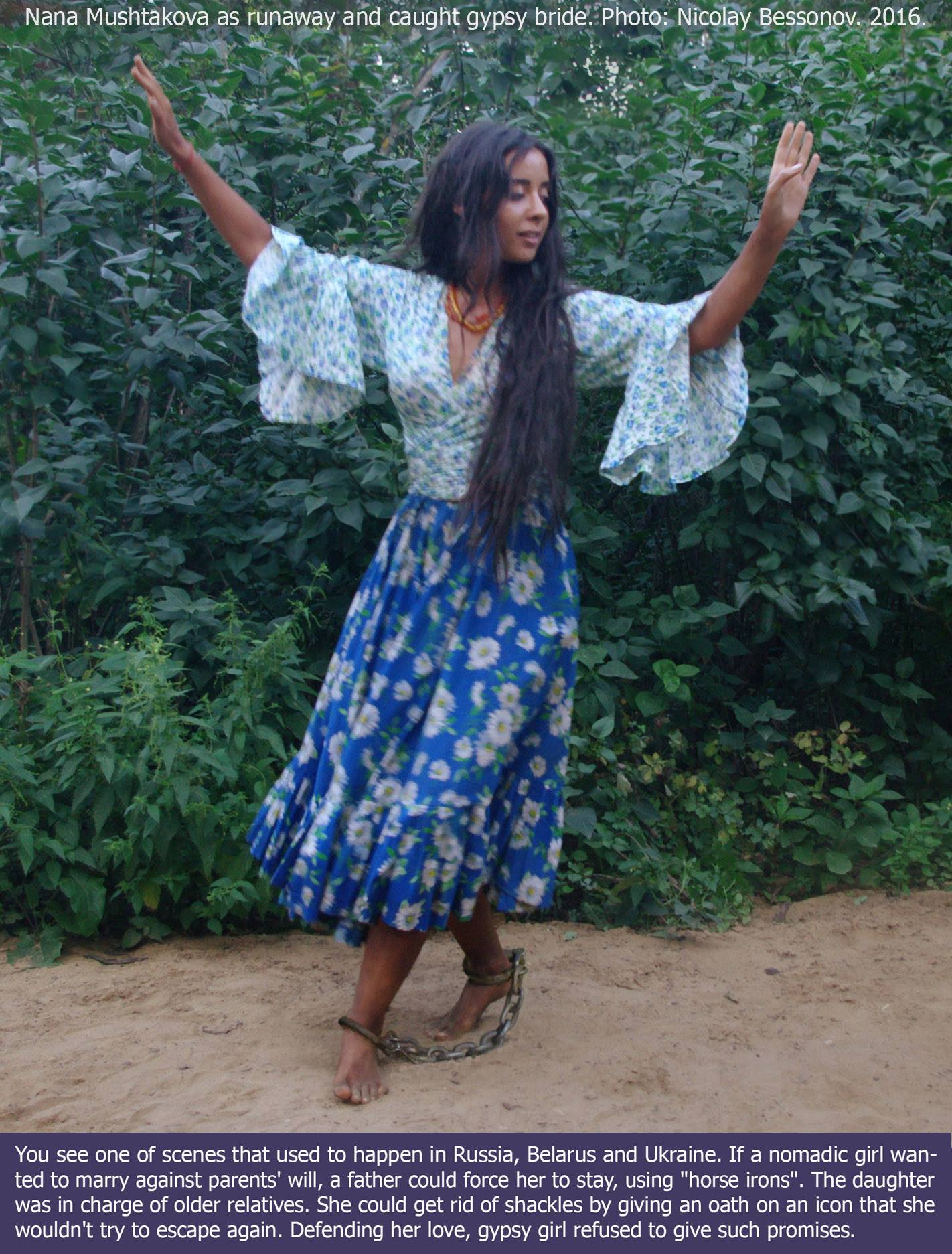 В художественной литературе принято было воспевать «кочевую свободу». Особенно распространённым был мотив, согласно которому таборная девушка – это вольная пташка. Реальность была иной. Иногда дочь пыталась сбежать замуж против воли отца. Если её ловили на полдороге, то старались удерживать насильно. Первые сведения об этом автор получил от русской цыганки Е.Н. Ружецкой в 2003 году. В детстве она побывала с отцом на стоянке чужого табора и увидела там девушку со скованными ногами. Оказалось, что эта она «недели за три до того пыталась сбежать с парнем». В дальнейшем автору удалось узнать, что такая практика существовала не только у этногруппы русска рома, но и у лотвов, кишинёвцев, а также у литовских и польских цыган. Желая счастья дочерям, отцы не желали выдавать их замуж в семьи, имевшие сомнительную репутацию. Между тем уже к 14 годам любая цыганочка обладала завидной самостоятельностью. Она была привычна к длительным переходам и ночёвкам под открытым небом, легко ориентировалась в лесу. Прокормиться она могла благодаря гаданию или пляске – наконец, еду можно было просто выпросить. Достаточно было лишь незаметно встать ночью. Расстроить её намерения могли только железные цепи.
