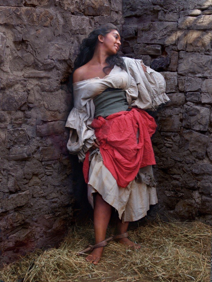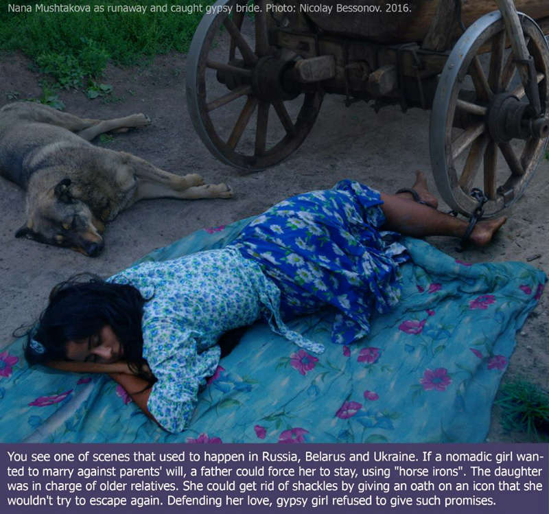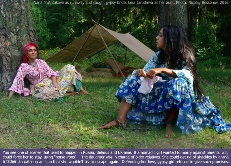 Перевод: Вы видите типичную сцену, которые до сих пор происходят в России, на Украине и Белорусии. Если девушке захотелось бы вступить в брак против воли родителей, отец мог бы заставить оставаться насильно, используя железные лошадиные путы. Дочь была ответственной перед старшыми родственниками. Она могла бы избавится от оков, давая клятву на иконе, что она не захочет пробовать бежать снова. Защищая свою любовь, цыганская девушка отказывается давать такие обещания. Основным же мотивом такого негуманного отношения к собственным детям является лишение их свободы выбора. Прежде практика родителей препятствовать выбору дочерей была распространена, не только в цыганских, но и в русских семьях, и хорошо, что практика реального заковывания девушек в кандалы осталась, в основном, в прошлом. Цыганская дочь
