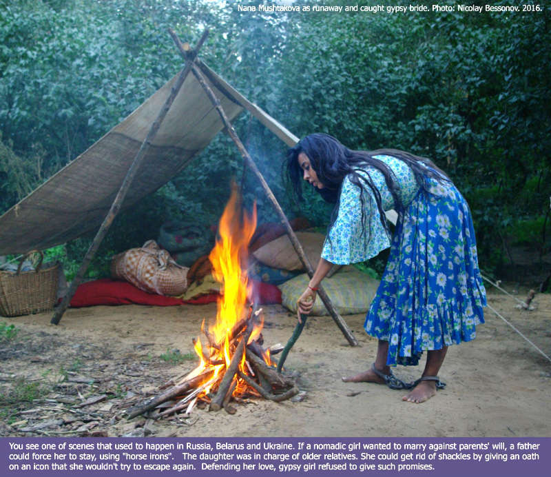 «Бывает, отец сам присмотрит жениха… А она другого любит. Сбежит. А отец сразу ловить поедет. Не один. Ещё кого с собой возьмёт. Если перехватят по пути, то отберут и обратно привезут. И всё. Чтобы снова не сбежала, ноги ей запрут… по-цыгански это называется састера, а по вашему… Не помню… Лошадям ноги закрывали. Путы железные. Цепи цыгане раньше на коней ложили – вот и её в такие цепи. Ну, и станут следить. Потому что дочка твердит: «Я его люблю. Что хотите со мной делайте – я всё равно убегу». Проходит полмесяца, месяц. Батька каждый день предлагает икону взять. Пускай отведут её старые цыганки в церкву, и она поклянётся, что не будет бежать. Клятву с неё требуют. Чтобы забожилась на отца, на мать, на братьев. На всю семью. А она к иконе не идёт. – Не буду я этого делать! Или просто молчит. Это что значит? Получается – хочет она бежать? Тогда батька говорит: – Пока ума не наберёшься, будешь ходить так. И делают ей кандалы. Мерку с ног снимают. Пока на ней были састера, она еле ковыляла. Там цепь была толстая, короткая. А на кандалах будет подлиньше. Полметра наверное. Чтоб могла ходить по табору хорошо. Эта цепь не тяжёлая. Всего два пальца толщиной. Теперь она и за дровами пойдёт, и за водой пойдёт. В деревню её не пустят, конечно. Там русские с ума сойдут. Напугаешь людей. Они же к нашему закону-то – не касаются. К цыганскому. Каждый русский скажет: «Ребёнка заковали!». Поэтому она только возле шатра. Костёр сделает. Самовар ставит. Или стирает. За ней мать-отец следят. А если в лес за хворостом – то пусть с девочками идёт. Она под присмотром теперь всегда. У неё браслеты железные. Они на замки заперты – а ключ у батьки в кармане. На ночь проденут цепь через колесо у телеги. Ведь не уследишь в темноте. Встанет, пока все спят – и поминай, как звали.